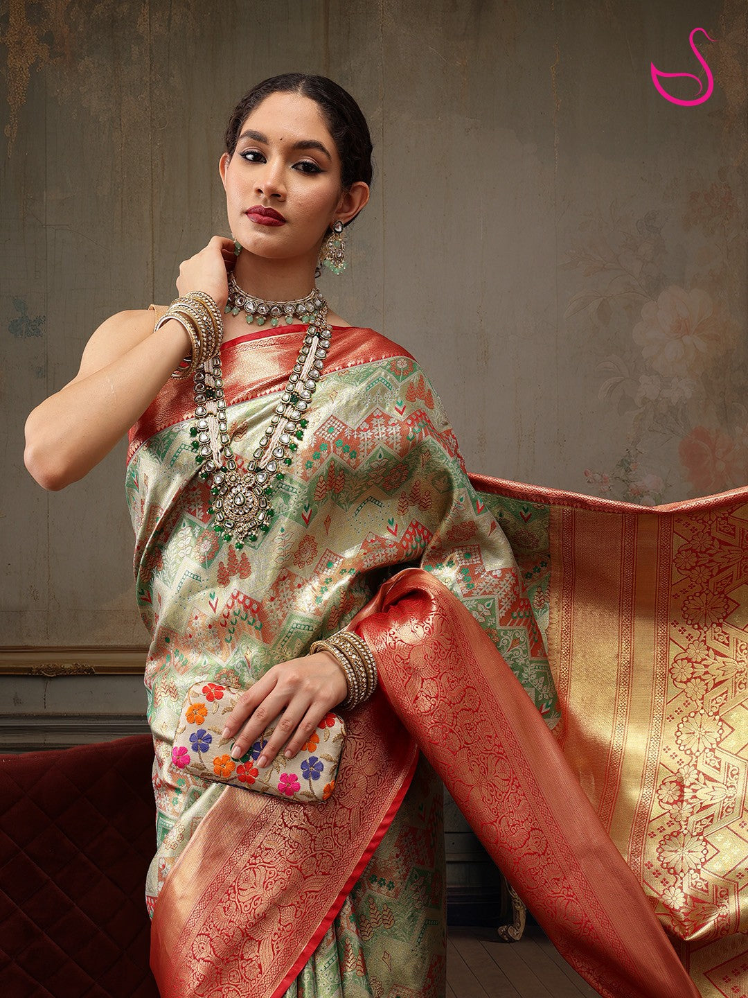 Elevate Tarangika with antique temple jewellery, kemp stone chokers, or layered pearls for an opulent festive look. A sleek bun adorned with fresh mogra will beautifully complement the chevron weave and floral pallu.